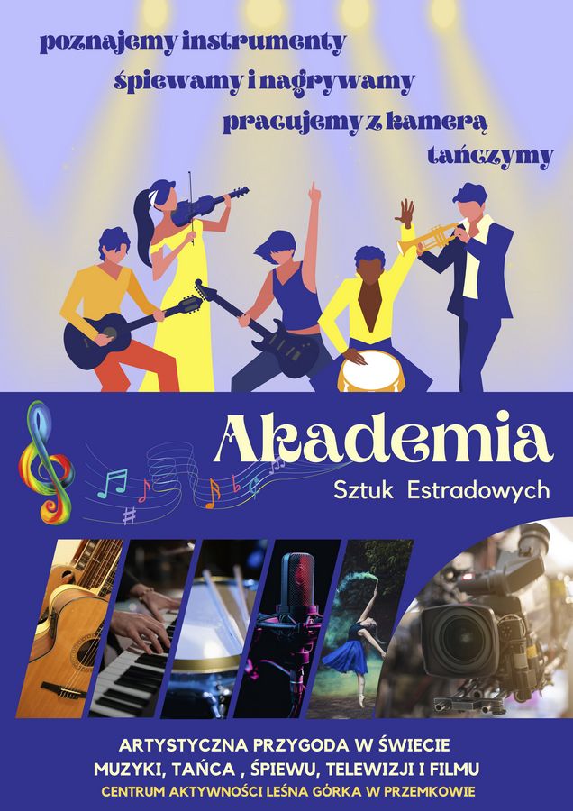 AKADEMIA SZTUK ESTRADOWYCH“ artystyczny warsztat mający na celu zapoznanie podopiecznych ze wszystkimi aspektami pracy na scenie, w filmie oraz w środowisku tańca i śpiewu. Profesjonalne zajęcia wokalne i taneczne. Obcowanie ze sprzętem filmowym. Możliwość zagrania na perkusji, gitarze, oraz instrumentach klawiszowych.