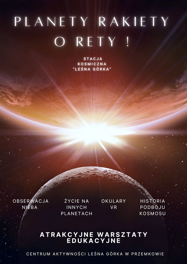 „PLANETY, RAKIETY, EKSPERYMENTY O RETY“ warsztat naukowy polegający na przekazywaniu wiedzy na temat kosmosu, planet układu słonecznego, podróży w kosmos ich historii i przyszłości. Nocna obserwacja nieba za pomocą teleskopu. Mini wykłady na temat zjawisk zachodzących w kosmosie mające na celu przekazanie wiedzy szkolnej z zakresu zjawisk zachodzących na naszej planecie. Czy istnieje życie na innych planetach ? wizje reżyserów i filmowców dotyczące życia w innej galaktyce. Czy jesteśmy sami w kosmosie ? Spacer po Księżycu – okulary VR.