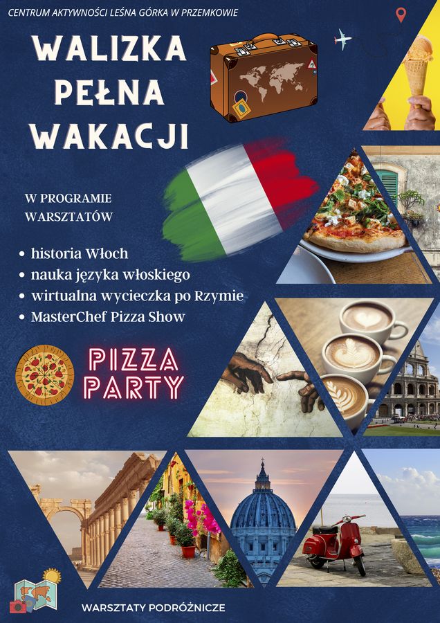 Każdy lubi podróżować, odkrywać nowe miejsca – te egzotyczne i te blisko domu „Walizka Pełna Wakacji“ to warsztaty na których będziemy uczyć się jak bezpiecznie podróżować. Poznamy egzotyczne kraje, inne kultury, potrawy i zwyczaje. Co wolno w danym kraju, a czego nie wolno ? Poznamy historię pierwszych podróżników i odkrywców, prześledzimy ich metody i trasy podróżowania. Sprawdzimy czy jeszcze coś jest na Ziemi do odkrycia ? W tym dniu wybierzemy się w wirtualną podróż do Włoch. Zwiedzimy zabytki wiecznego miasta Rzym, poznamy jego historię i sprawdzimy jak dzisiaj się żyje w Italii. Będziemy uczyć się podstawowych słów języka włoskiego.