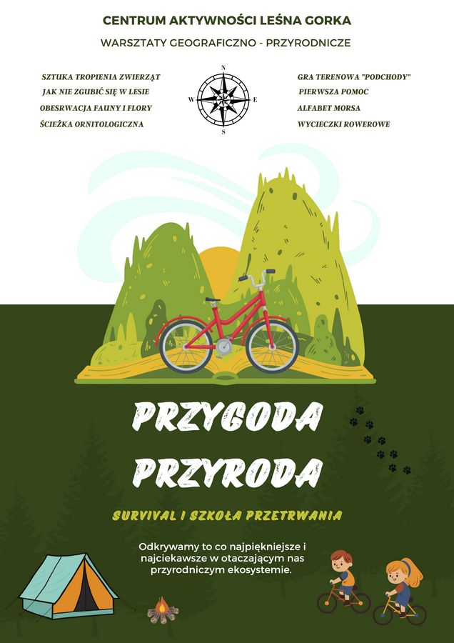 „PRZYGODA I PRZYRODA“ wycieczki rowerowe i piesze w formie aktywnych podchodów w terenie. Poznanie walorów przyrodniczych miejsca w którym znajduje się Leśna Górka. Aktywny warsztat pozwalający odkryć wiele pięknych miejsc powiatu, uczący historii, pozwalający aktywnie spędzić czas w pięknych okolicznościach przyrody.